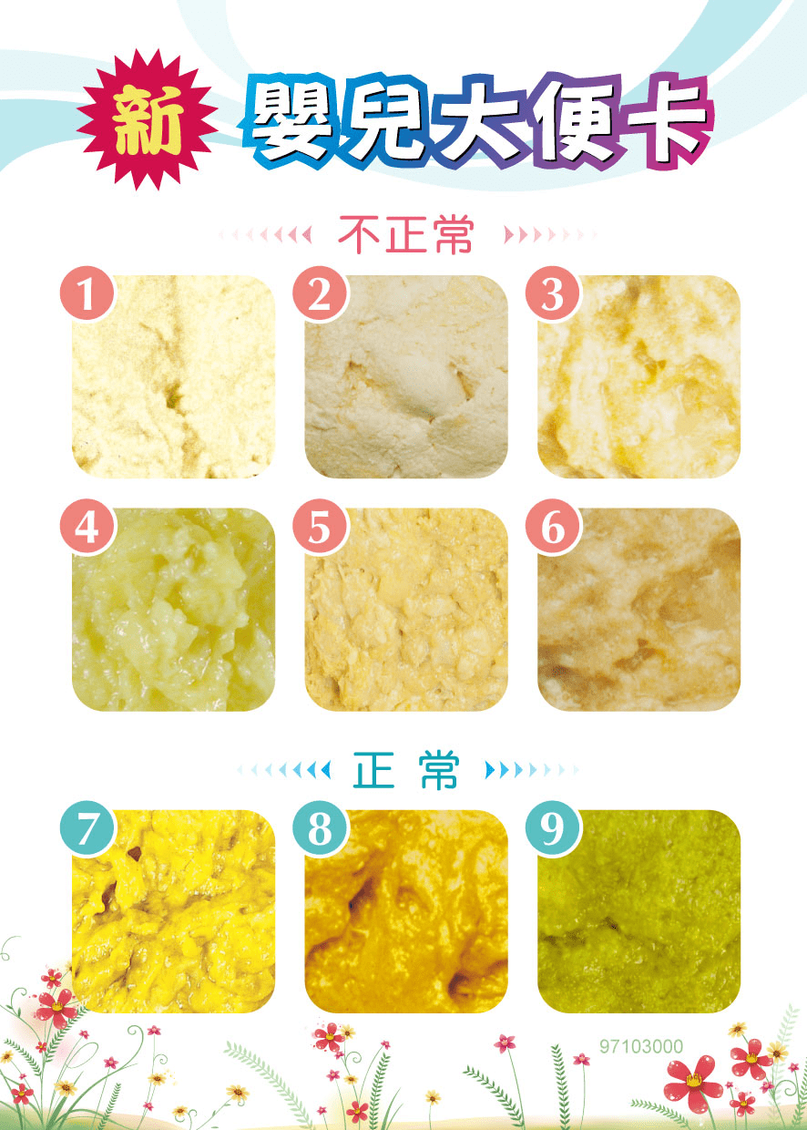 寶寶的便便跟成人一樣有很多不同的顏色,除了圖卡上的”正常”顏色以外,出現草綠色、青綠色、墨綠色都算正常的便便。