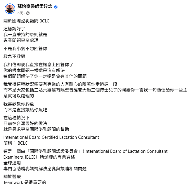 孕產婦知識百科, 最新消息為什麼蘇怡寧醫師也建議要找專業的國際泌乳顧問 IBCLC ? Posted on 06/16/2025 by Bevis為什麼蘇怡寧醫師也建議有泌乳、母乳相關問題要找專業的國際泌乳顧問 IBCLC ?要取得這張證照,除了考核以外,還需要花費大量的時間在臨床實習,為什麼不建議有疑問的媽咪去詢問親友 ?親友以自身經驗出發給出的建議通常都不太準確 !國際泌乳顧問 IBCLC 透過專業教材及大量的臨床經驗,能夠針對各種不同乳房、泌乳狀況來協助有需求的媽咪藍田與其他月子中心不一樣的地方,就是我們每個館別都有至少一位資深國際泌乳顧問 IBCLC ! 因此媽咪如果有乳房、泌乳狀況到藍田後都能迎刃而解 !相關 超級可愛的雙胞胎「招財」&「進寶」- 藍田寶寶如何讓寶貝與寵物共處 – 簡單三步驟✨
